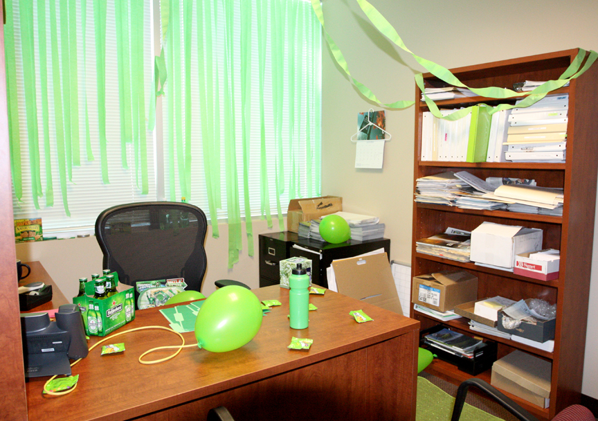 It was just another day as I walked in after a doctor’s appointment. But things looked different as I strolled through the hallway…my team gave me a “green carpet” welcome! A “green carpet” greeted me, a six-pack Heineken sat next to me; green balloons filled my office, green skittles and life-saver mints fought for space on my desk. A few green files reminded me of work and a green battle fist game said play is important.