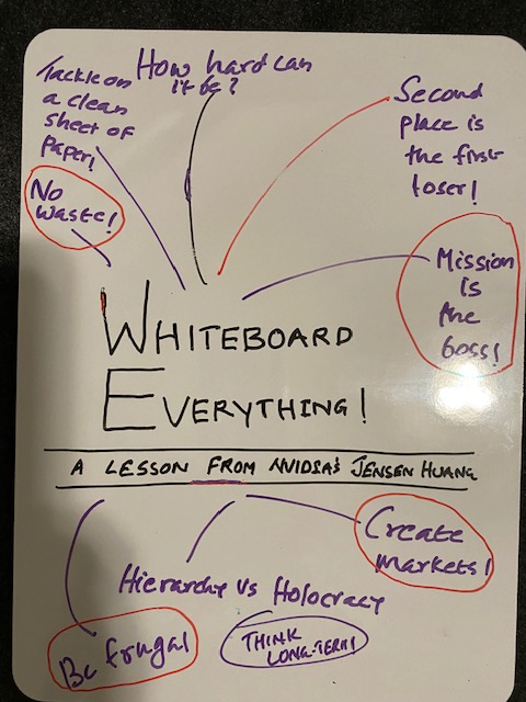 Huang prefers collaborative meetings over one-on-one interactions. He brings his whiteboarding approach to these settings. This fosters open debate and avoids preconceived ideas. Tae Kim’s book presents several practices, referred to as “Jensenisms,” that can be applied in our daily work: